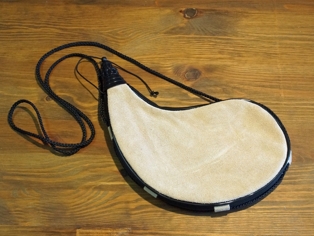Hergestellt aus Wildleder mit hygienischem Plastikinlay, sowie Tragriemen und aufschraubbarem Verschluss.