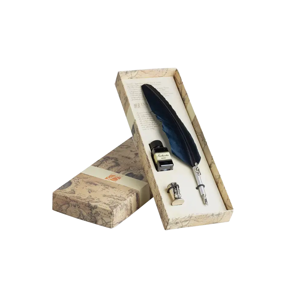 Dieses Schreibset enthält einen Kalligrafie-Federhalter, eine Halterung für die Feder, und eine 10ml Flasche schwarzer Kalligrafietinte.
