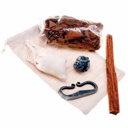 Hier ist alles enthalten, was man benötigt um mittelalterlich Feuer zu machen – Feuerstahl, Feuerstein, Zunder und eine Anleitung.