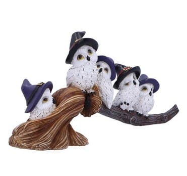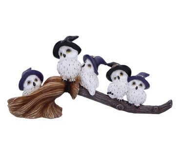 Fünf zauberhaft süsse Eulen, die sich auf einem Hexenbesen aneinander kuscheln.