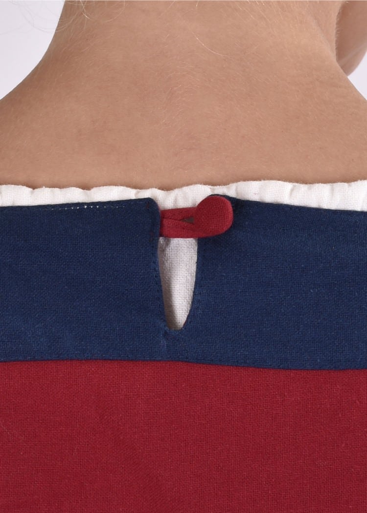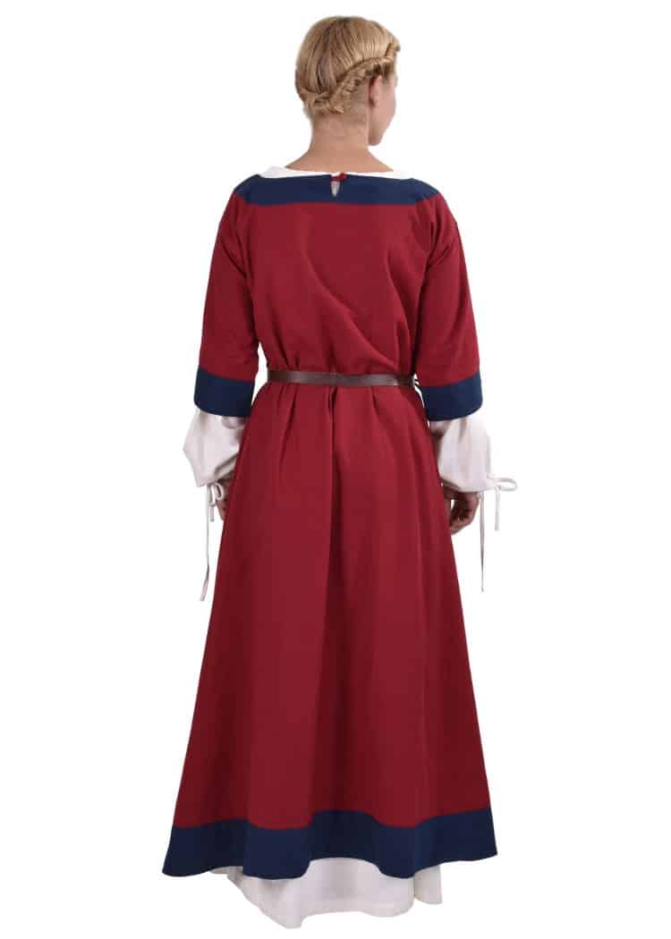 Das Besondere an diesem Kleid sind die farblich abgesetzten Details. Diese machen deutlich, dass es sich um ein Obergewand des Frühmittelalters handelt. Der Ausschnitt ist in der hinteren Mitte mit einem kleinen Schlitz versehen, welcher durch einen Knopf geschlossen wird.