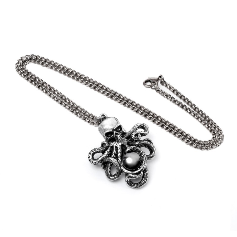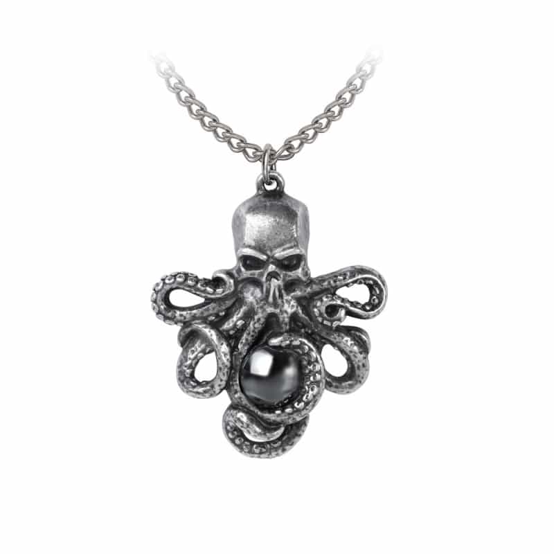 Ein Oktopus-Anhänger aus Zinn, dessen Körper die Form eines menschlichen Schädels hat und der in seinen Tentakeln einen schwarzen Graphit-Cabochon hält.