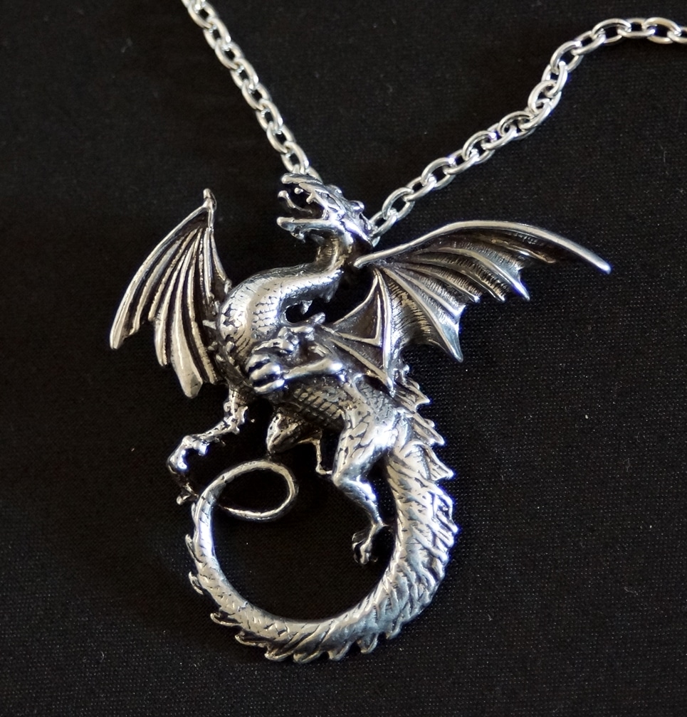 Durch die Grösse des Anhängers wirken Einzelheiten wie Schuppen und das Gesicht des Drachen noch lebensechter.