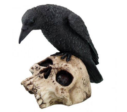 Ein Rabe sitzend auf einem Menschenschädel.