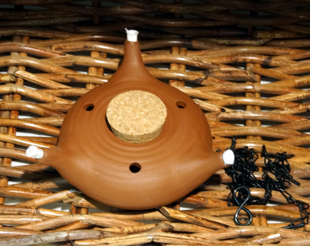 Diese schlichte Öllampe hat drei Dochthalter und kann mit den mitgelieferten Ketten einfach aufgehängt werden.