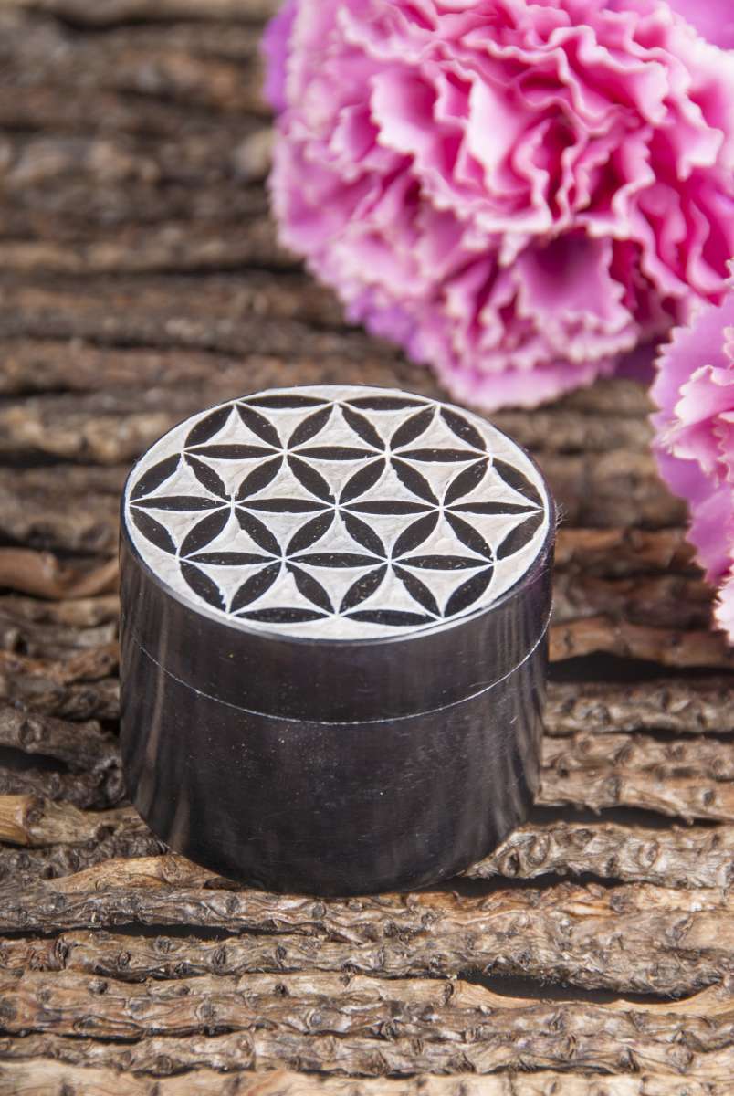 Ein süsses kleines Specksteindöschen mit handgravierter Blume des Lebens zum Aufbewahren wichtiger kleiner Dinge.