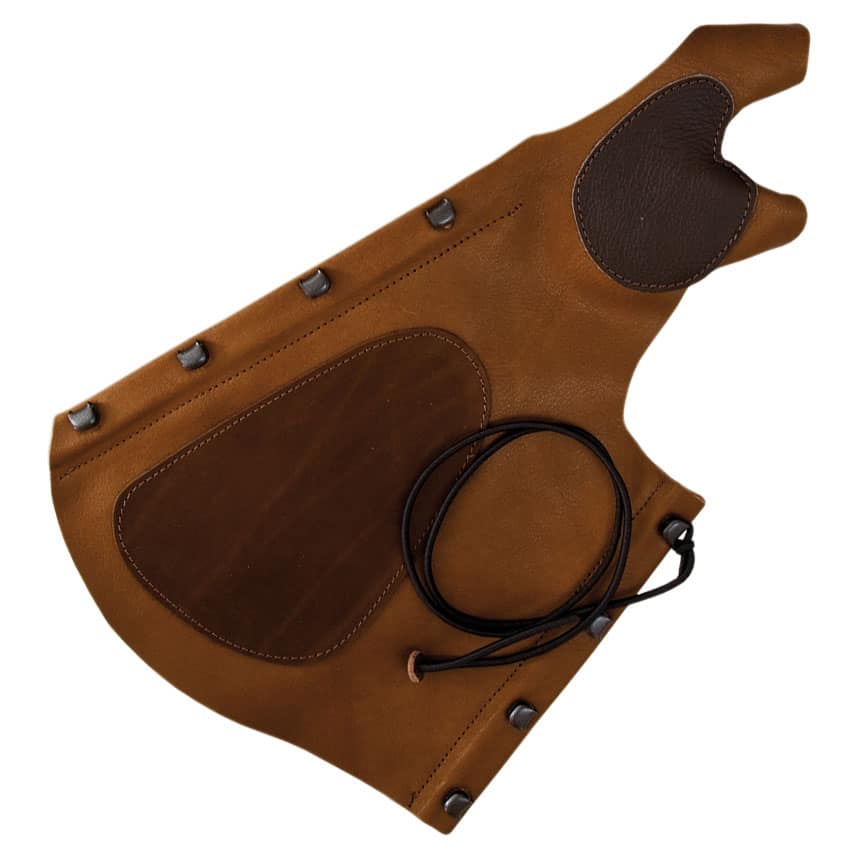 Es handelt sich dabei um eine Kombination aus Schiesshandschuh für die Bogenhand und Armschutz in der Farbkombination Cognac-Braun.