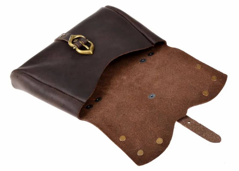 Die rechteckige Form der mittelalterlichen Gürteltasche und die verwendete Schnalle orientiert sich an historischen Vorbildern.
