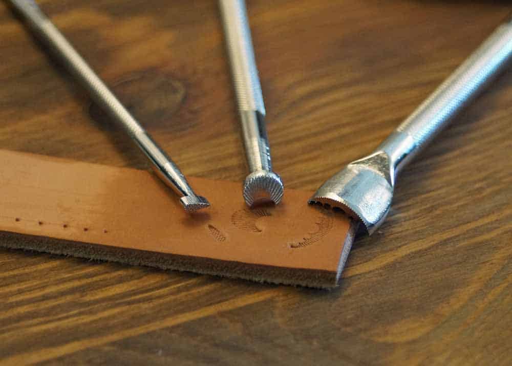 Zuerst wird das Leder mit dem Lappen nass gemacht, dann setzt man die Stempel an und drückt das Motiv mit einigen Hammerschlägen ins Leder.