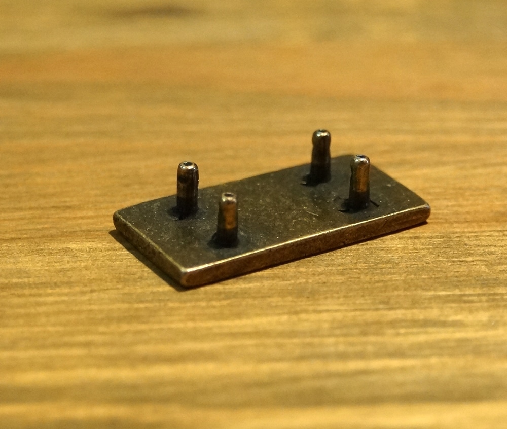 Auf der Rückseite befindet sich vier Stifte von 3 mm Länge, auf die zur Befestigung einfach kleine, mitgelieferte Kappen aufgesetzt und mit ein paar leichten Hammerschlägen fxiert werden.