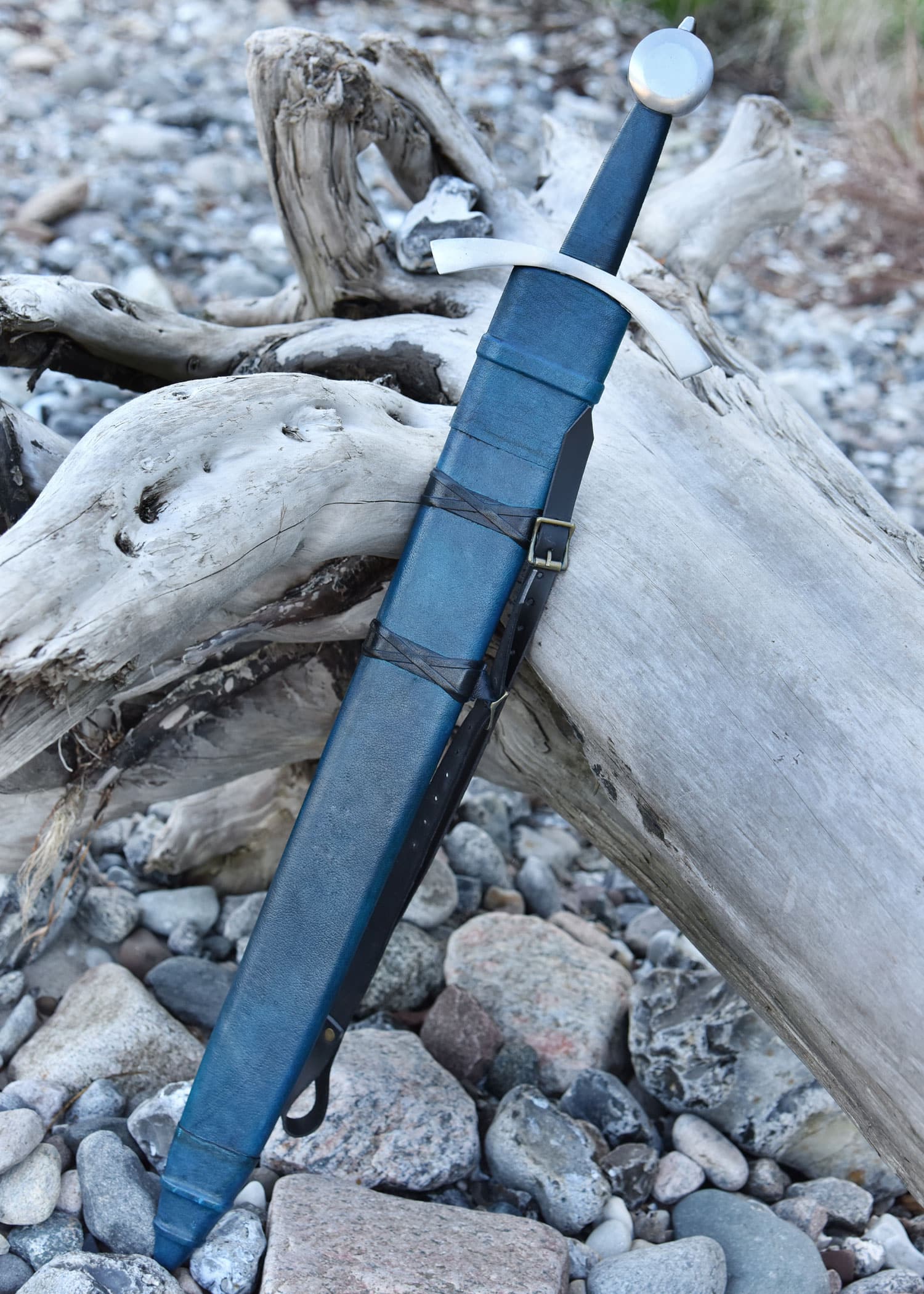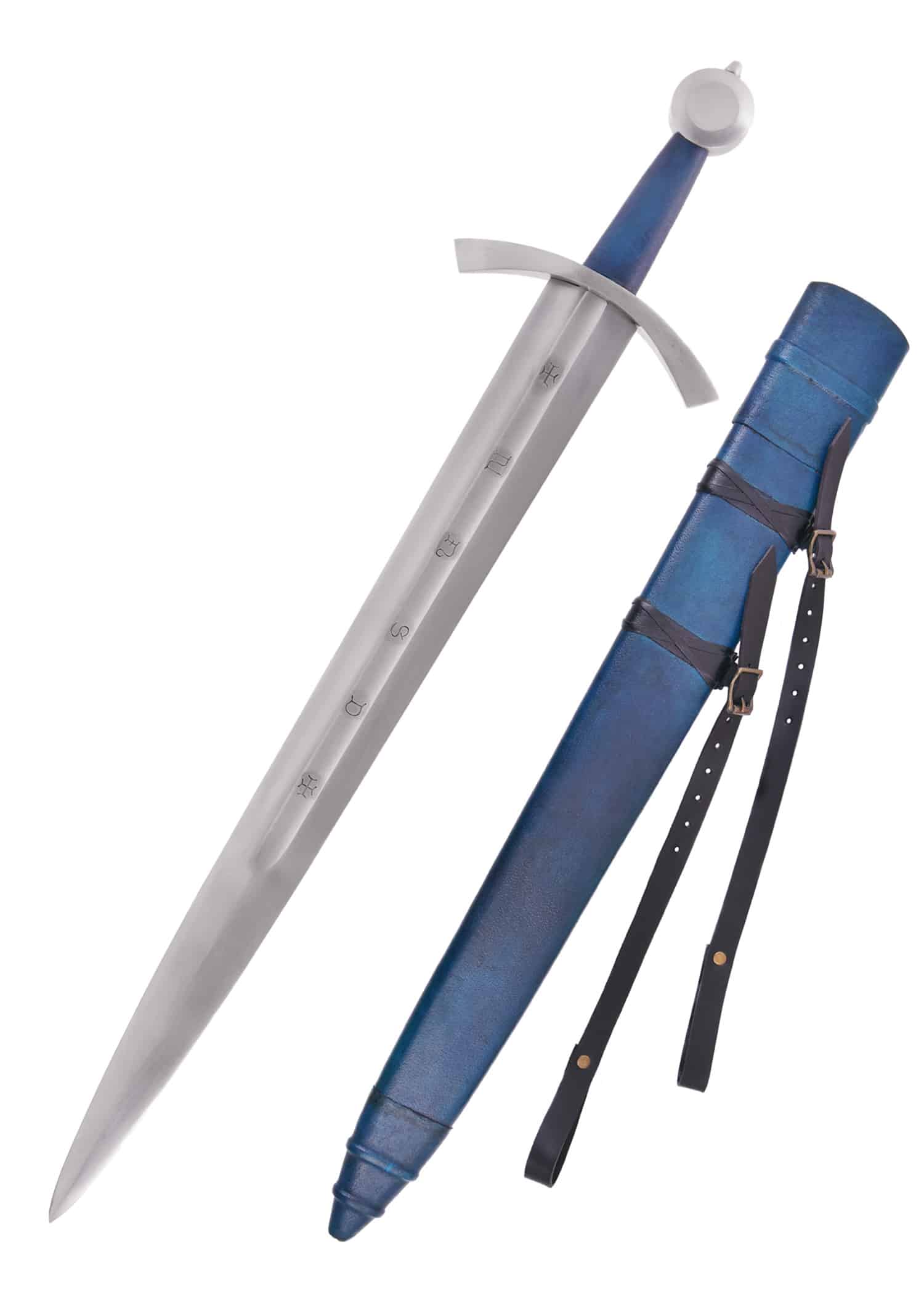 Geliefert wird dieses mittelalterliche Ritterschwert samt blauer Holz-/Lederscheide mit zwei längenverstellbaren Trageriemen aus schwarzem Leder und Messingschnallen in Antikfinish.
