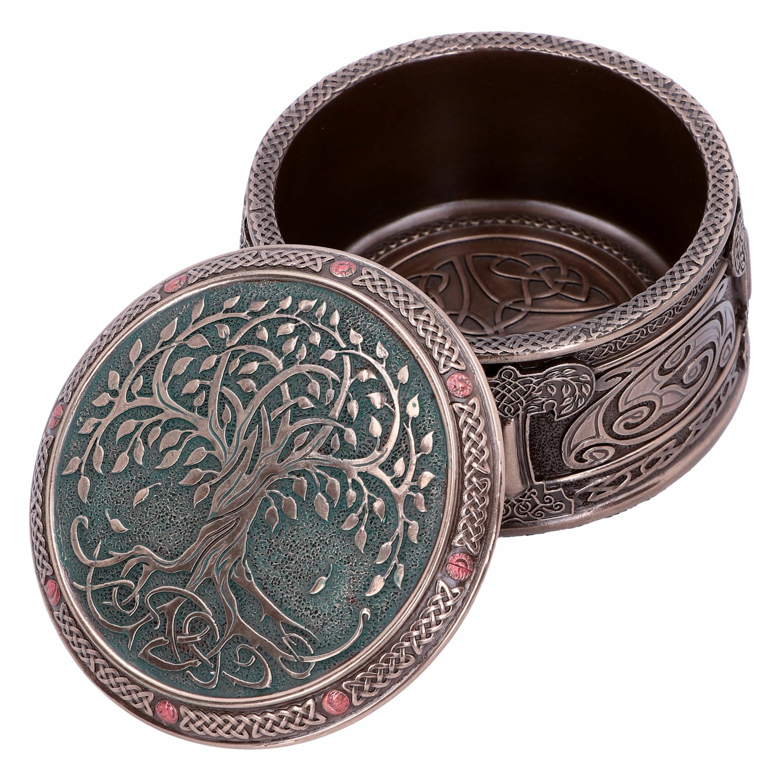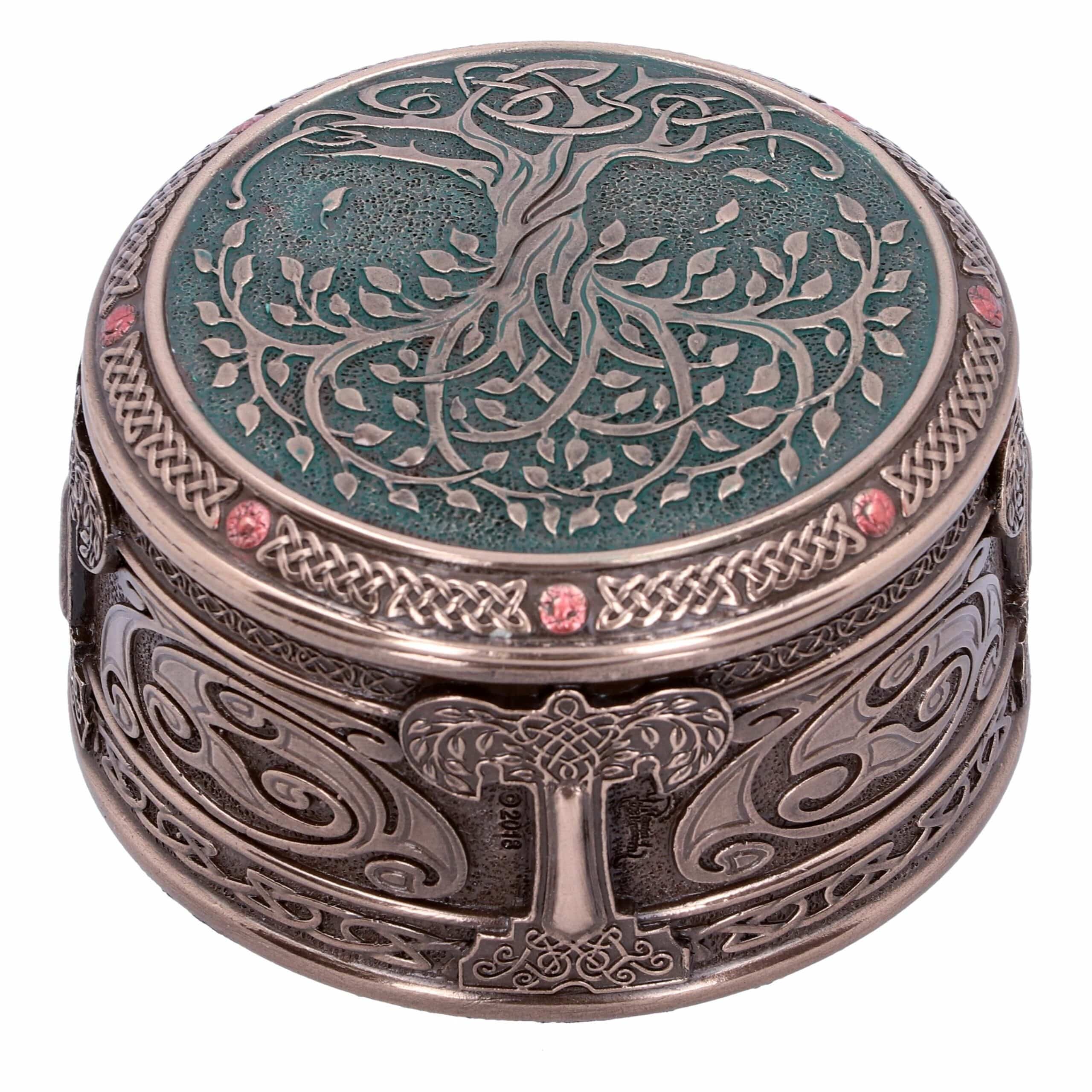 Eine tolle Schatulle mit der Abbildung des keltischen Lebensbaums und schönen Ornamenten. Die Ornamente und Knotenmuster ziehen sich auch auf dem Rand und sogar im Inneren weiter.