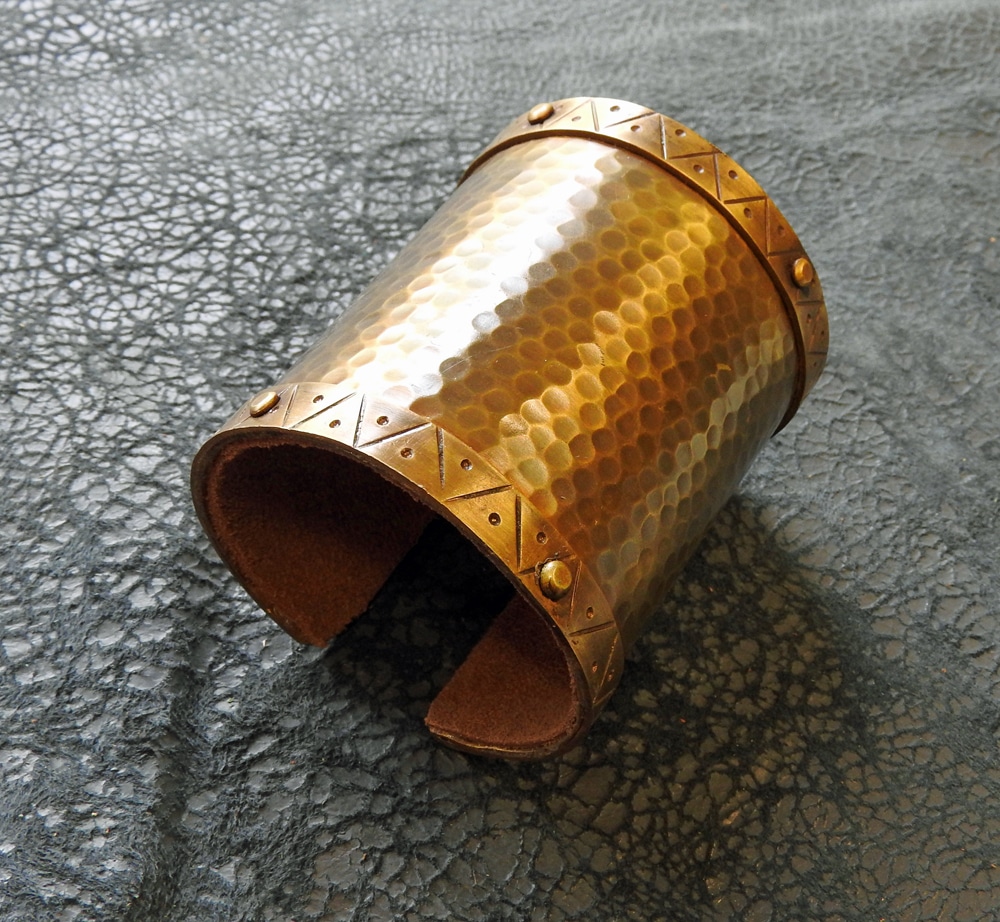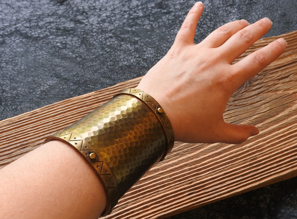 Ein massiver breiter Armreif aus kunstvoll verarbeiteter Bronze.