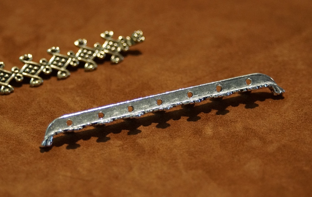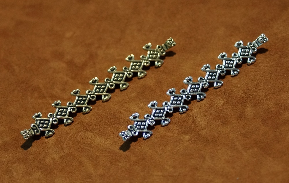Stabkettenverteiler wurden zur Befestigung mehrerer übereinander befindlicher Perlenketten zwischen den Schalenfibeln in der Frauentracht der Wikinger gebraucht.