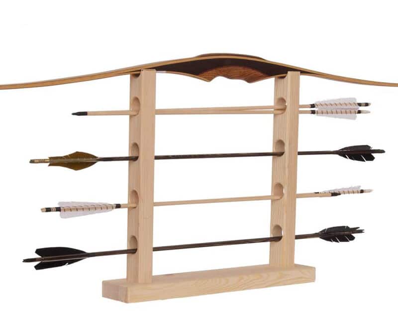 Der Ständer wird aus massivem Kiefernholz gefertigt und bietet Platz für einen Bogen und mehrere Pfeile.