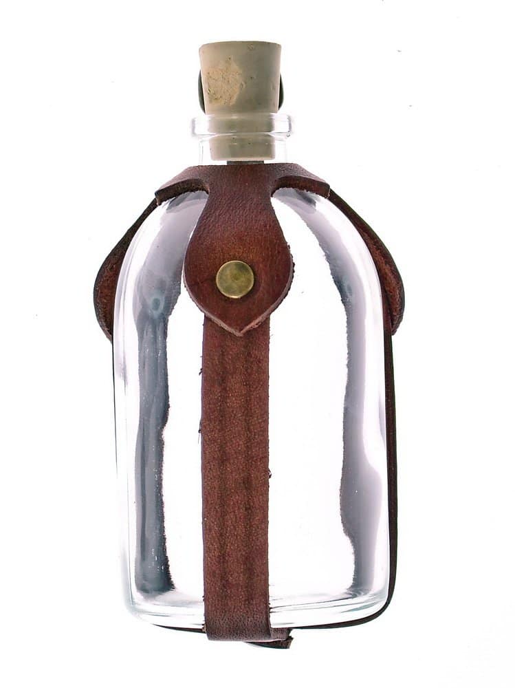 Die stabile Glasflasche ist je nach Wunsch mit braunem oder schwarzem Leder eingefasst.