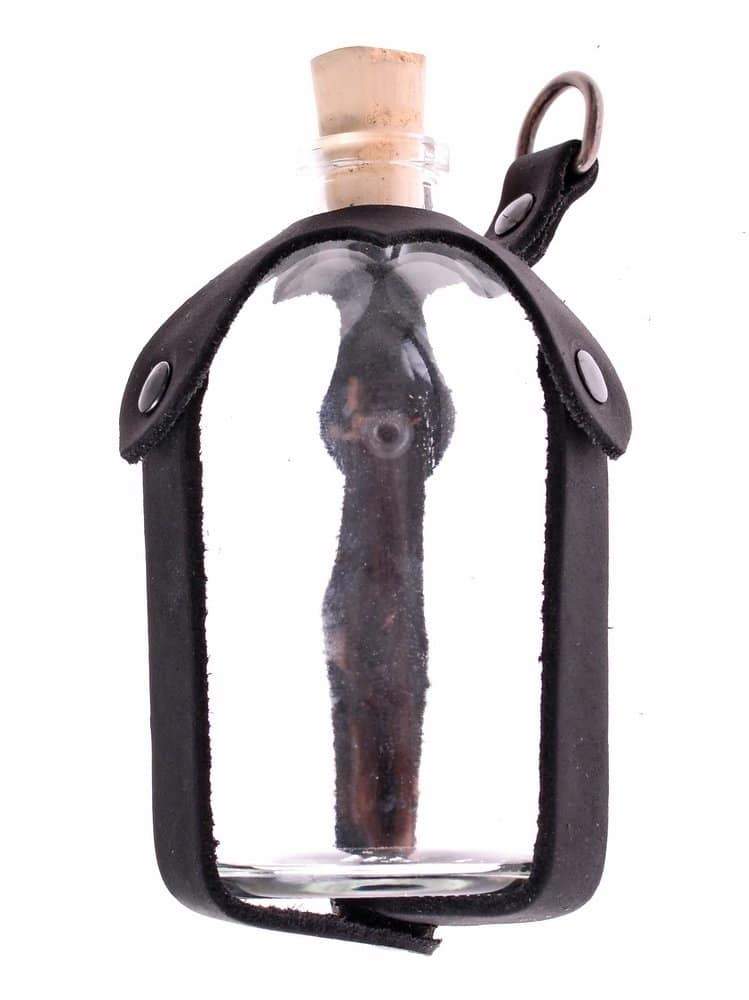 Die Flasche kommt zusätzlich mit einem stabilen vierkannt Lederriemen daher, um sie z.B. am Gürtel oder einer Tasche zu befestigen.