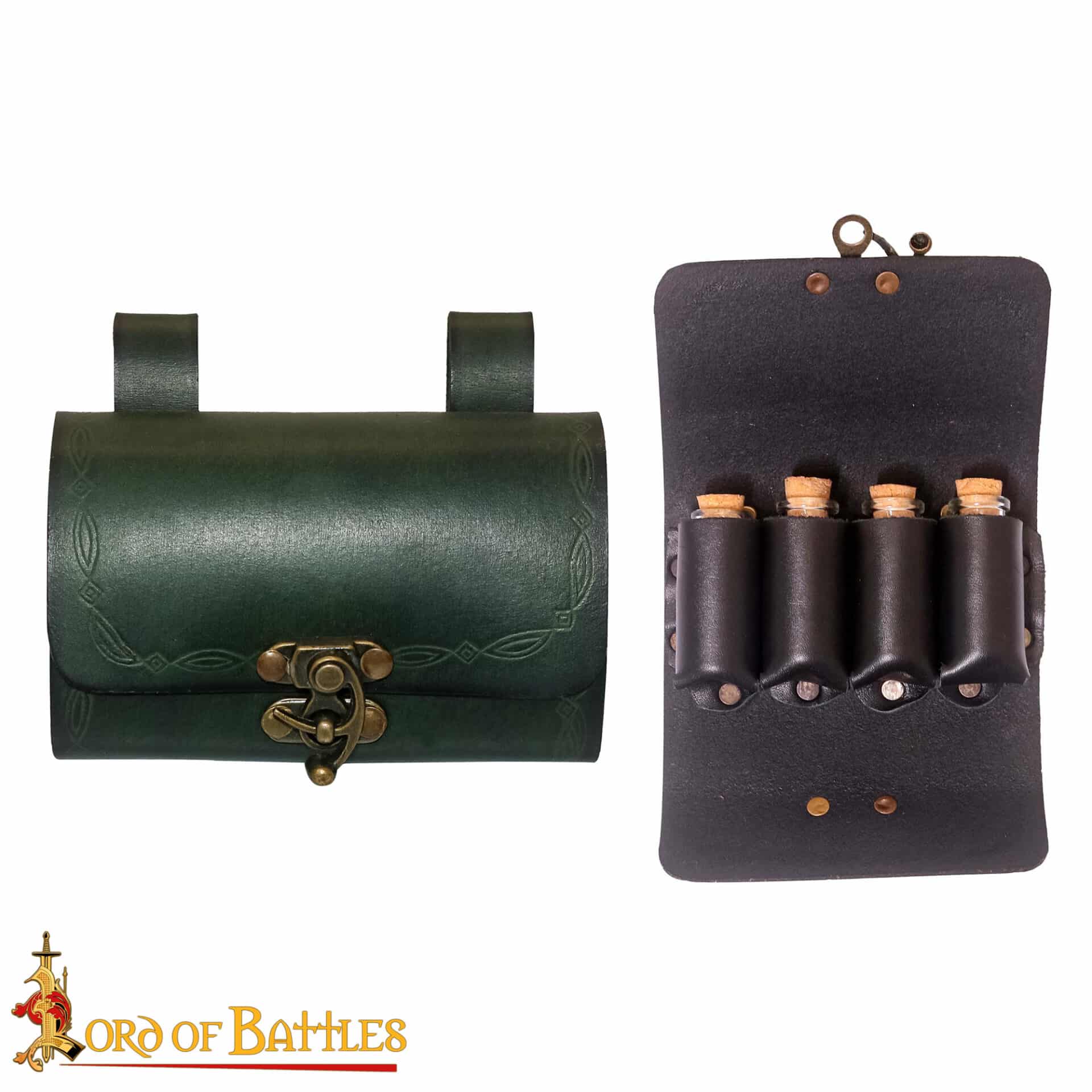 Eine Tasche mit vier Glasfläschchen für zauberhafte Tränke, heilsame Elixiere, oder Kräutermischungen.