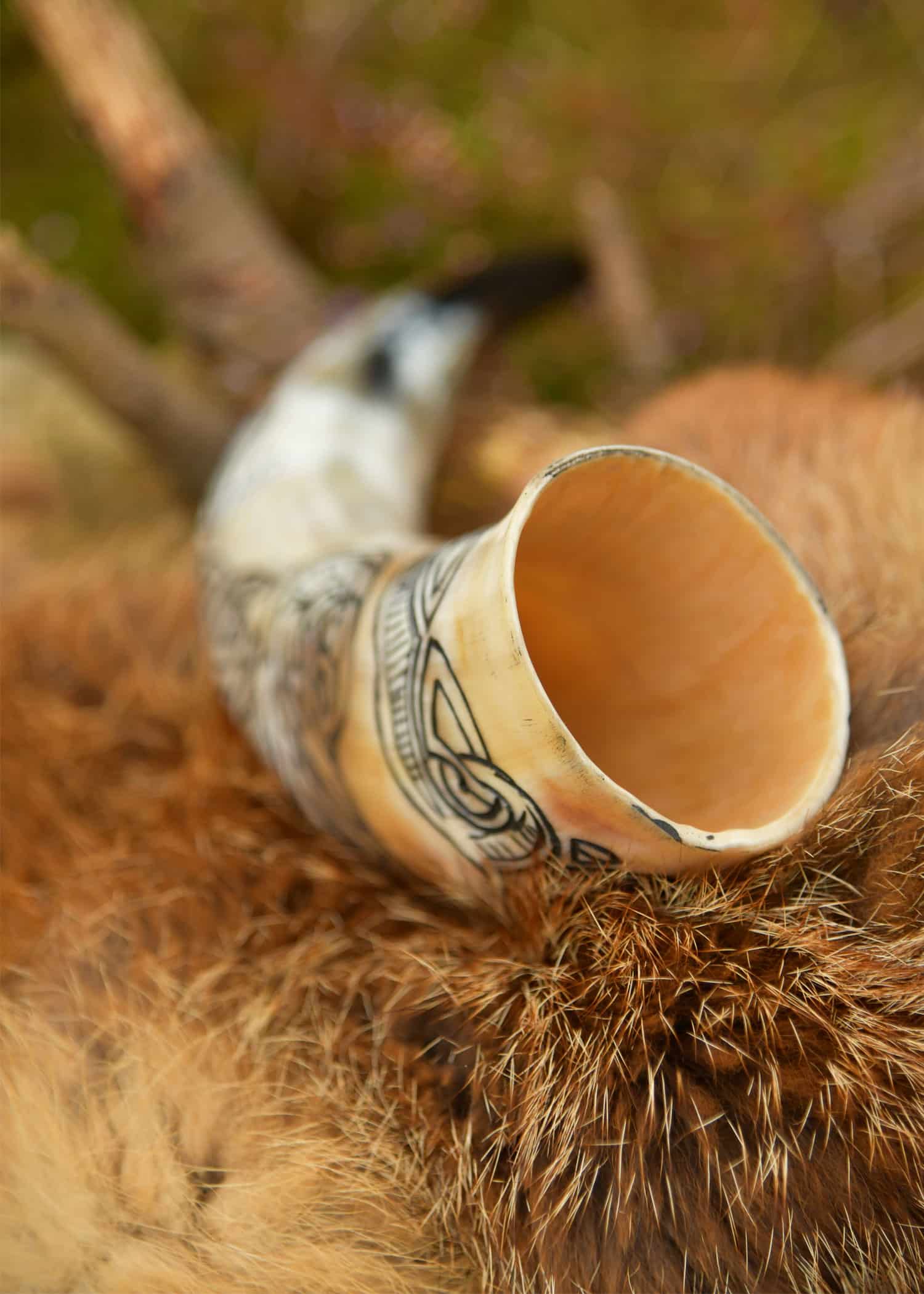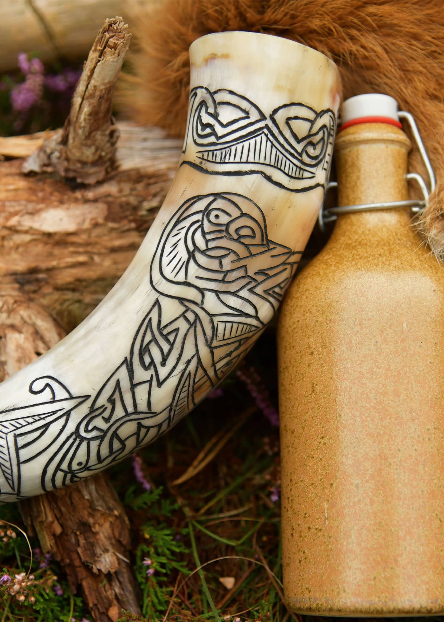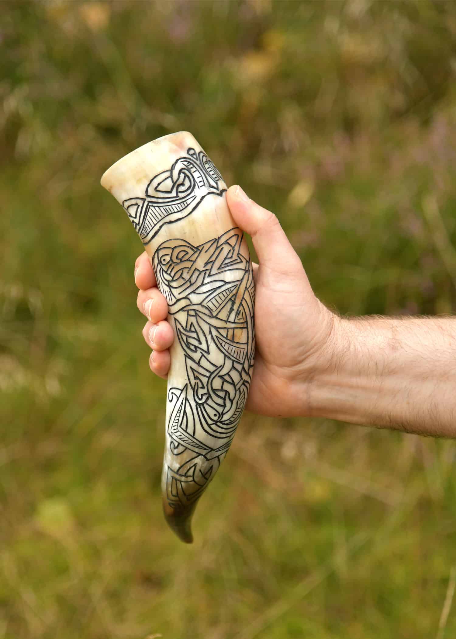 Ein Horn mit schöner detaillierter Musterung, die eingeritzt und mit schwarzer Farbe nachgezeichnet wurde.