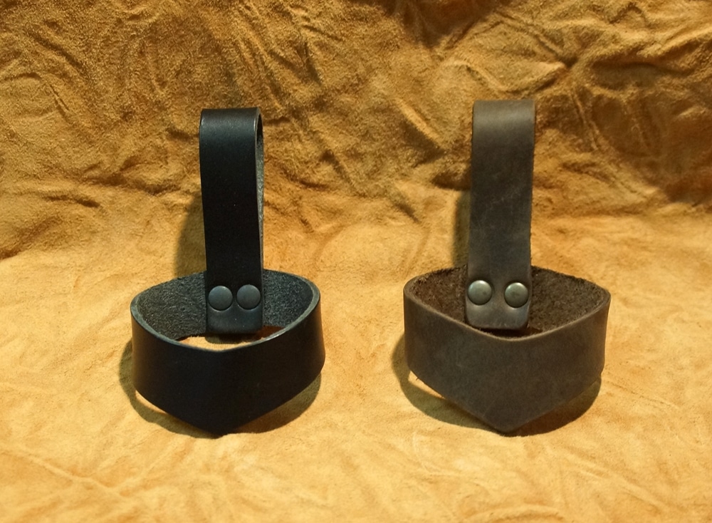 Die obere Schlaufe wird durch einen Gürtel gezogen. In die untere wird dann das Trinkhorn gesteckt.