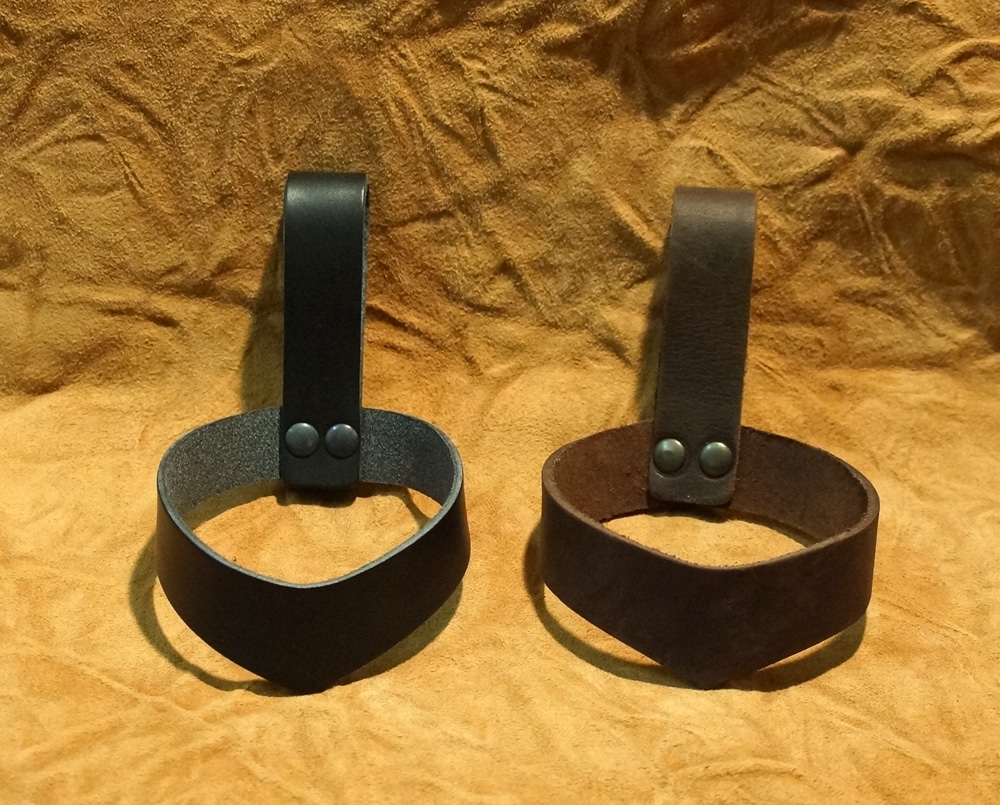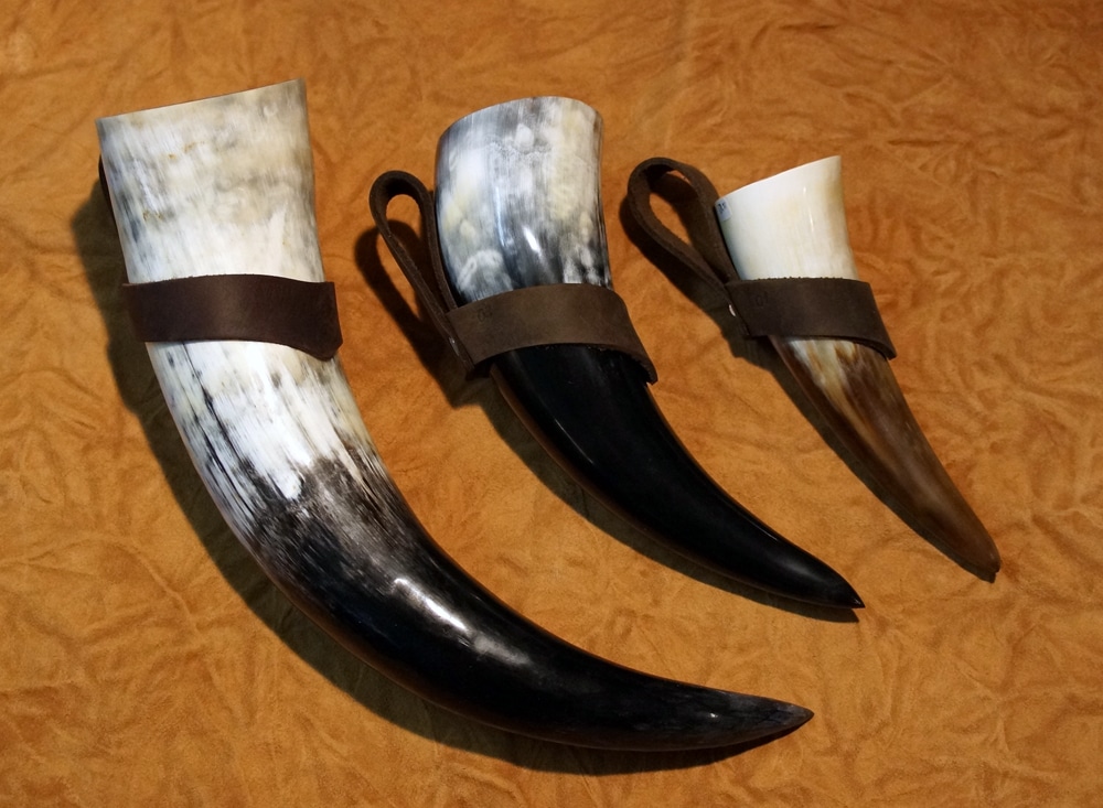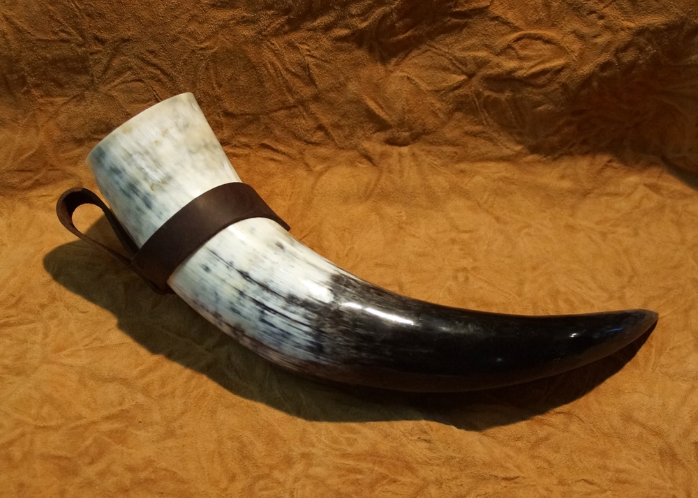 Die obere Schlaufe wird durch einen Gürtel gezogen. In die Untere wird dann das Trinkhorn gesteckt.