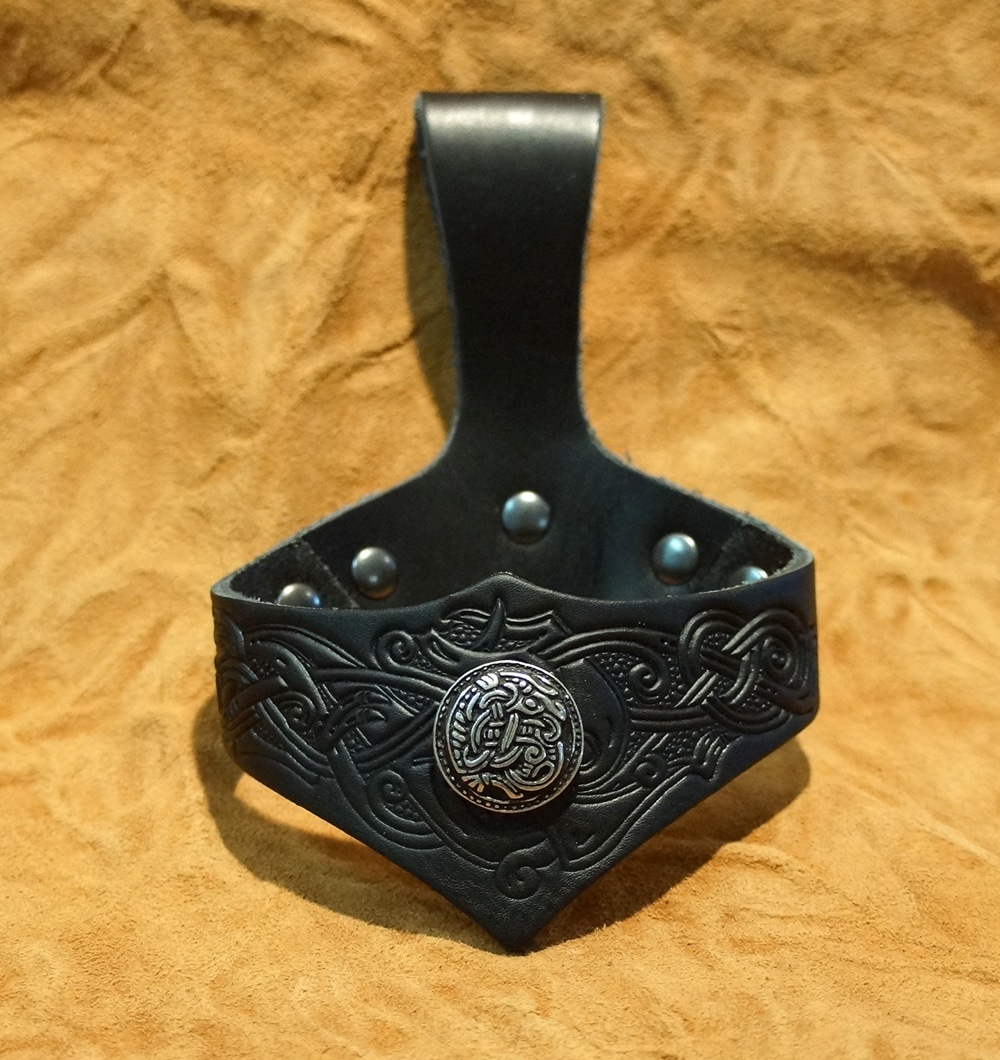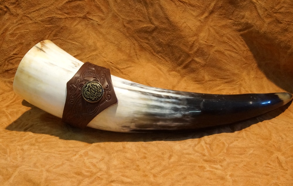 Die obere Schlaufe wird durch einen Gürtel gezogen, n die Untere wird dann das Trinkhorn gesteckt.