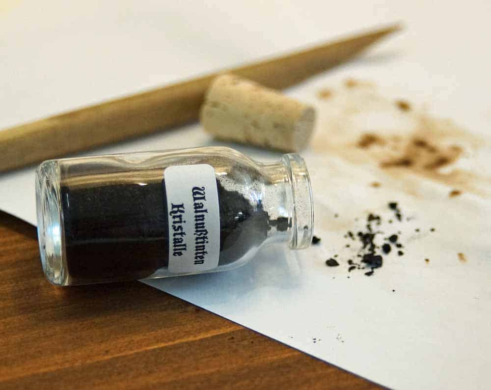 Einfach wenige der Kristalle in Wasser auflösen bis es aussieht als hätte man einen Kaffe vor sich, und dann mit einem Papiertuch das gefärbte Wasser über das zu alternde Papier streichen. Zusätzlich können mit einzelnen Tropfen des Tintenwassers super Effekte gezaubert werden.