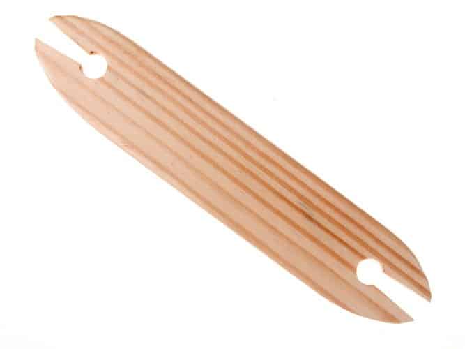 Dieses Webschiffchen aus sorgfältig poliertem Kiefernholz endet auf der einen Längsseite in einer schmalen Kante, auf der anderen Längsseite ist die Kante abgerundet.