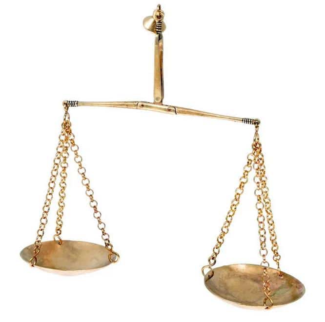 Sie besteht aus zwei Waagschalen, die sich mit kleinen Ketten an einem zusammenfaltbaren Arm befinden. Zusammengeklappt findet der Arm und die Ketten Platz in den übereinandergelegten Waagschalen.