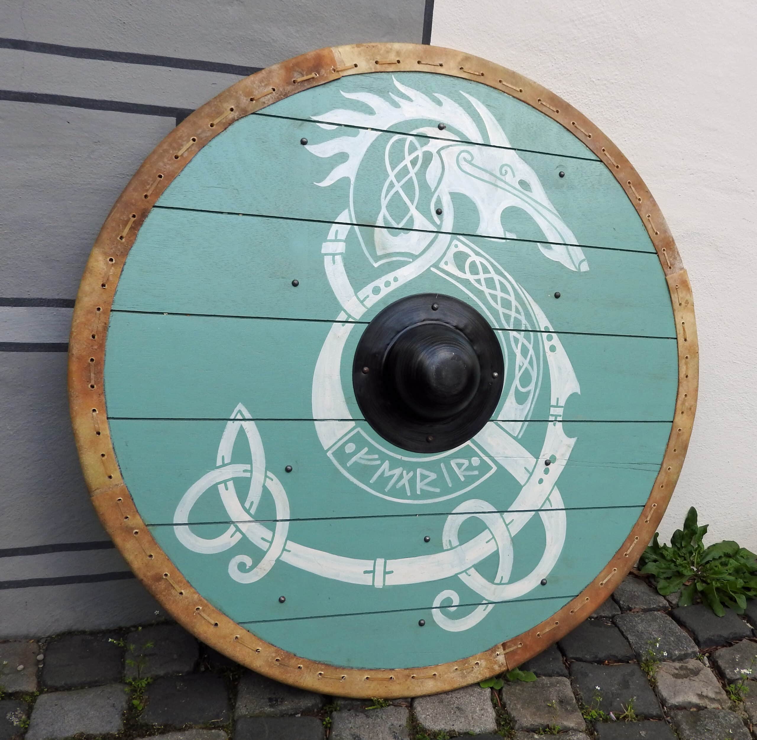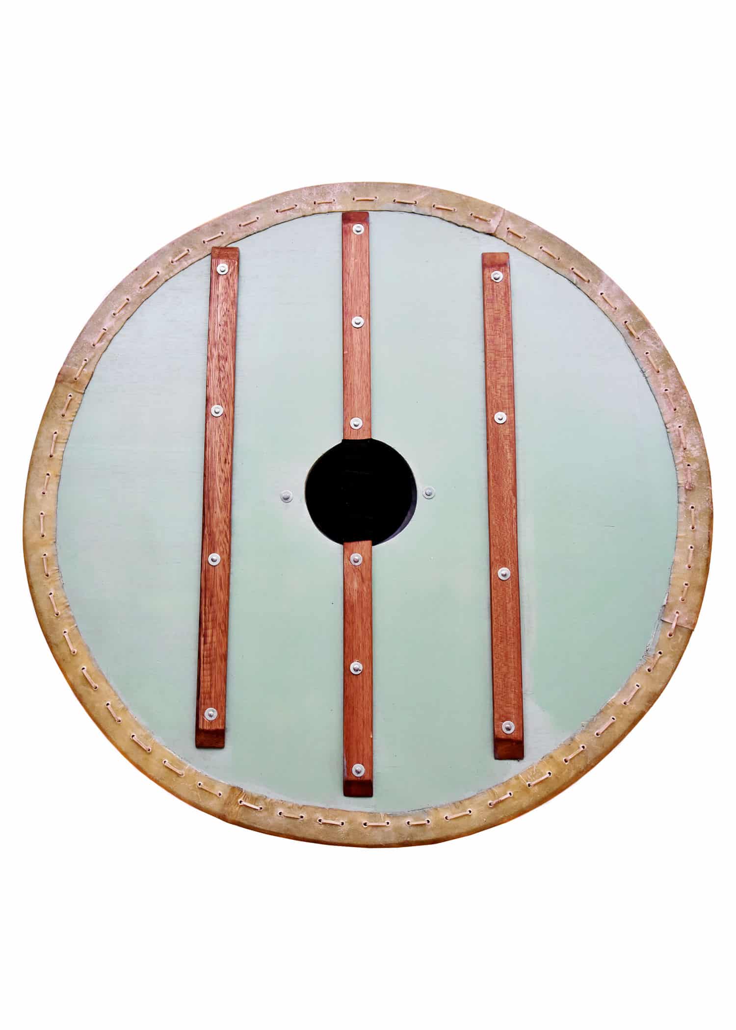In der Mitte des Schildes ist ein grosszügig ausgelegter Stahlbuckel angebracht, welcher mit vier Nieten fest in Position fixiert ist, und selbst für kräftige Wikingerhände genügend Platz bietet. Der Schildrand ist mit Rohhaut (Pergament) verkleidet, und die Rückseite des Schildes ist mit drei vernieteten Verstärkungsleisten aus Holz ausgestattet. Die mittlere Leiste dient zudem als Faustgriff und ist für einen bequemen Halt auf Höhe des Schildloches mit Leder umwickelt.