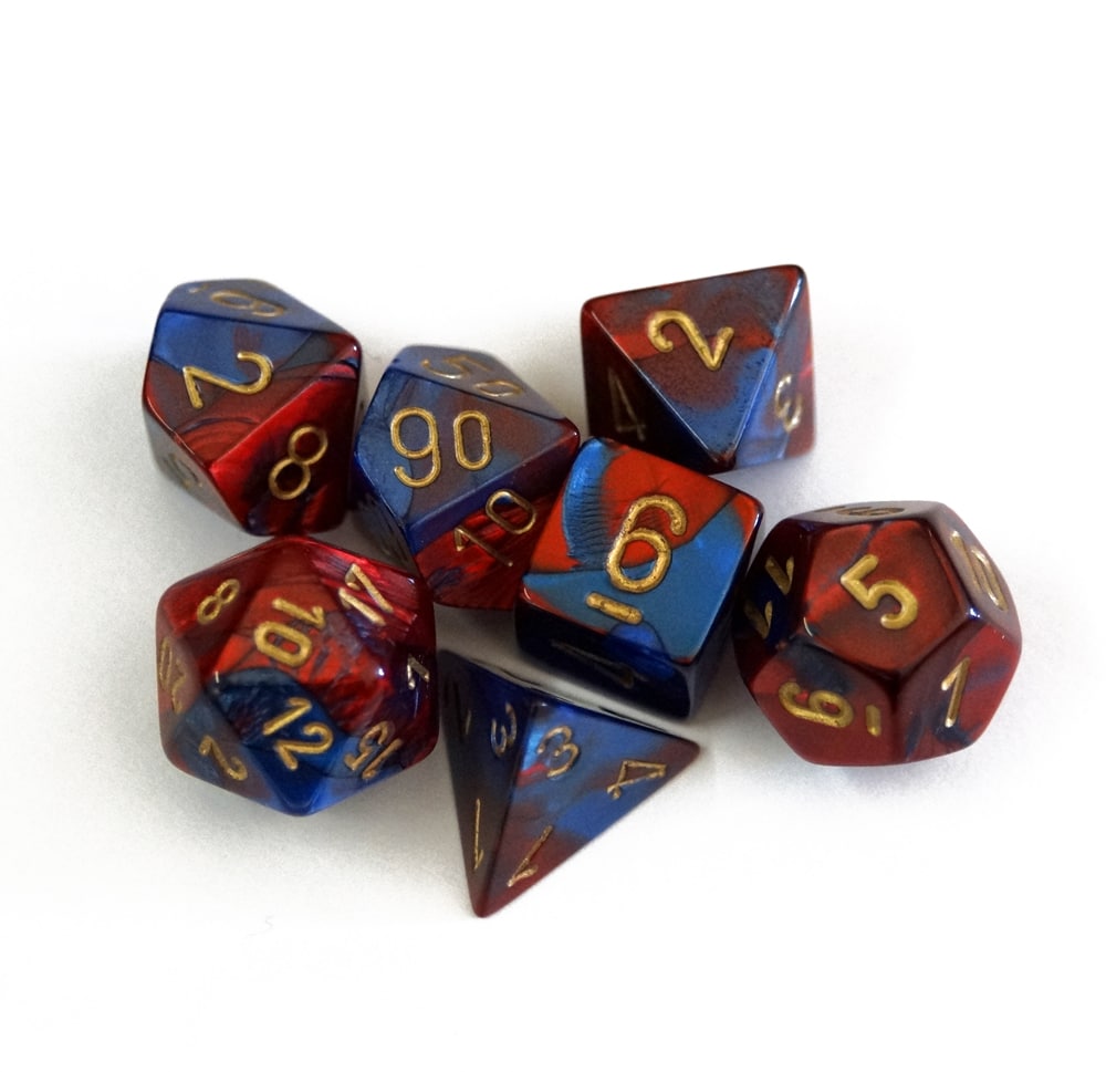 Es werden sieben Würfel mit unterschiedlicher Seitenzahl in einer kleinen Plastikbox geliefert.